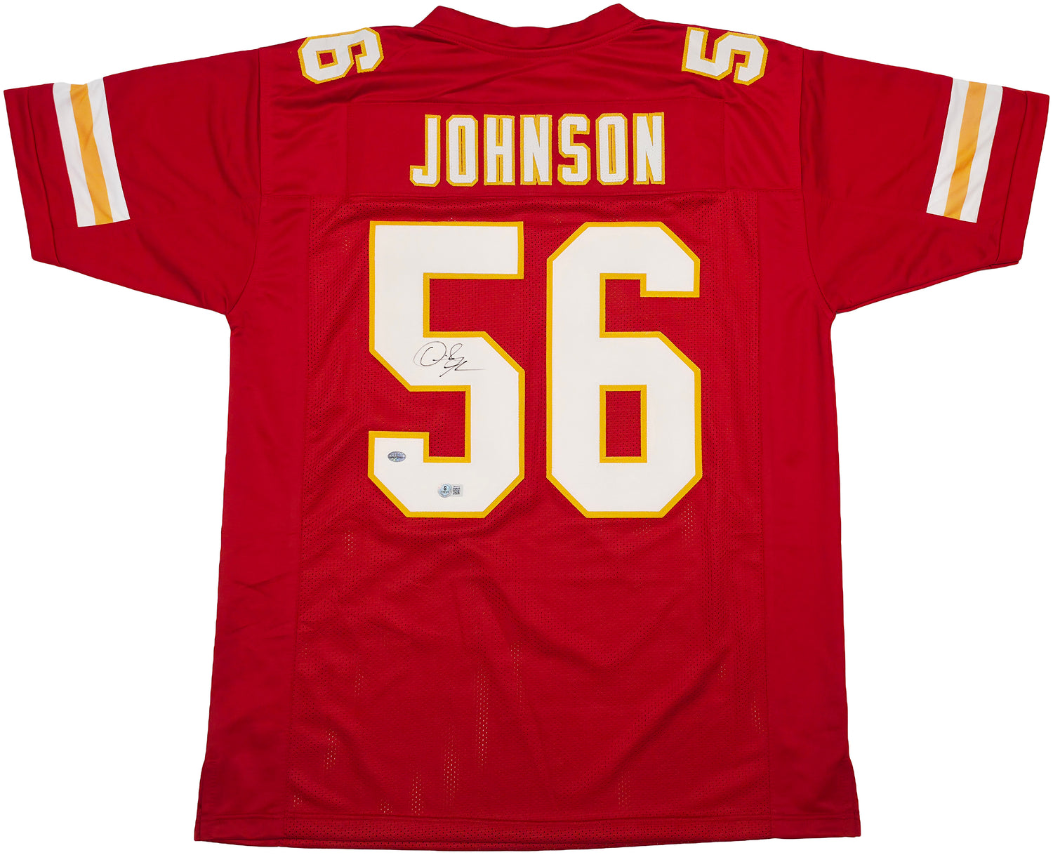 Celebrate the hard-hitting legacy of one of the Kansas City Chiefs' all-time greats with this hand-signed Red Jersey autographed by Derrick Johnson. As the franchise's all-time leading tackler and a fan favorite throughout his 13-season career (2005–2017), Johnson's impact on the field is undeniable—making this autographed piece a must-have for true Chiefs fans and sports memorabilia collectors alike. This is a custom jersey, not affiliated with any licensed brand, but it proudly features sewn-in name and numbers for an authentic, display-worthy finish. Authenticated by one of the most trusted names in the industry, this collectible comes with a Beckett Authentication Services (BAS) tamper-proof hologram, ensuring 100% authenticity and long-term value. Whether you're building your Hall of Fame wall or gifting a lifelong Chiefs fan, this signed Derrick Johnson jersey is a standout addition.