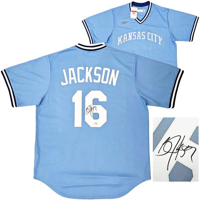 Kansas City Royals Bo Jackson Autographed Light Blue Nike Cooperstown Collection Jersey Size L Beckett BAS Witness Stock #218044