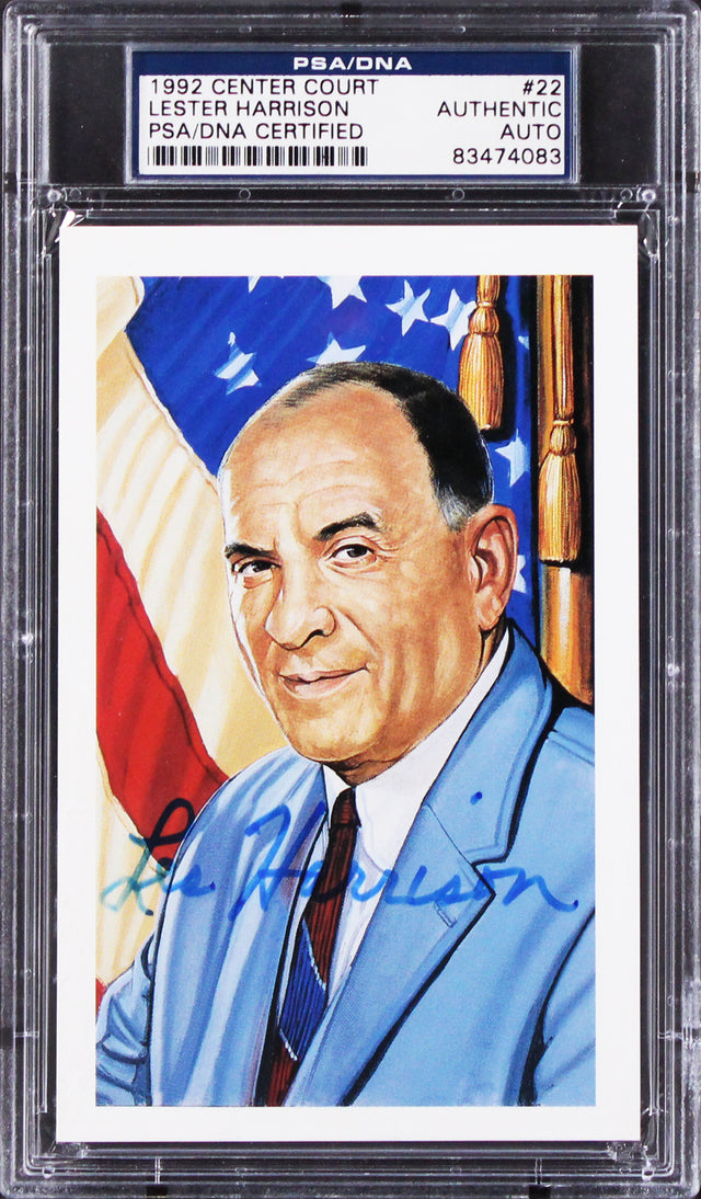 Own a piece of basketball history with this Autographed 3.5x5.5 1992 Center Court #22 Postcard, personally signed by Lester "Les" Harrison, a significant figure in professional basketball. This collectible comes slabbed and authenticated by PSA/DNA, ensuring its 100% authenticity, which can be verified on the Professional Sports Authenticator website.