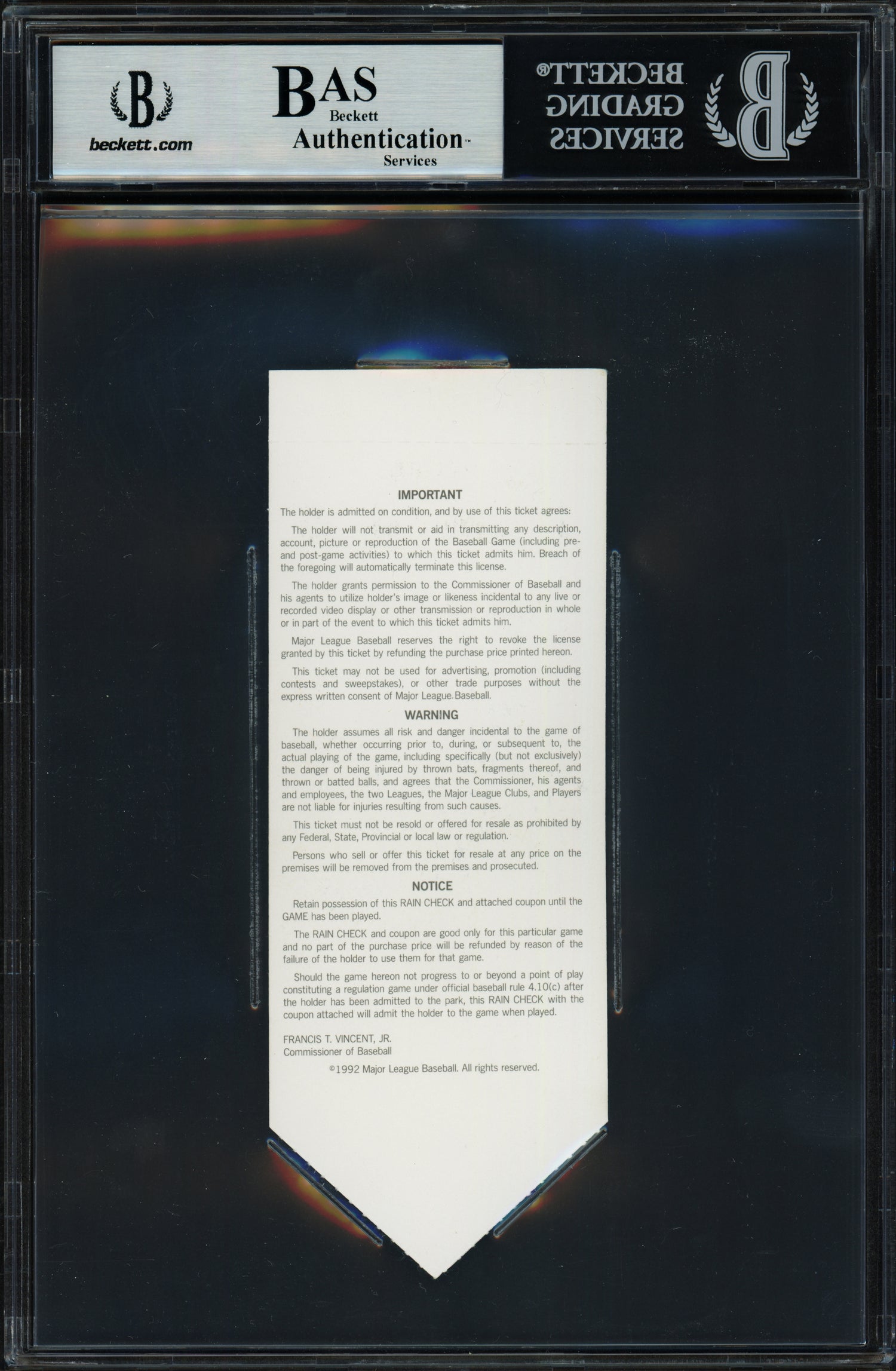 This approximately 2.5 x 5.5-inch ticket features an authentic signature from Ken Griffey Jr. along with the special inscription "92 AS MVP", commemorating his MVP achievement. To ensure authenticity, it has been certified by Beckett Authentication Services (BAS) and comes professionally encapsulated within their tamper-proof holder.