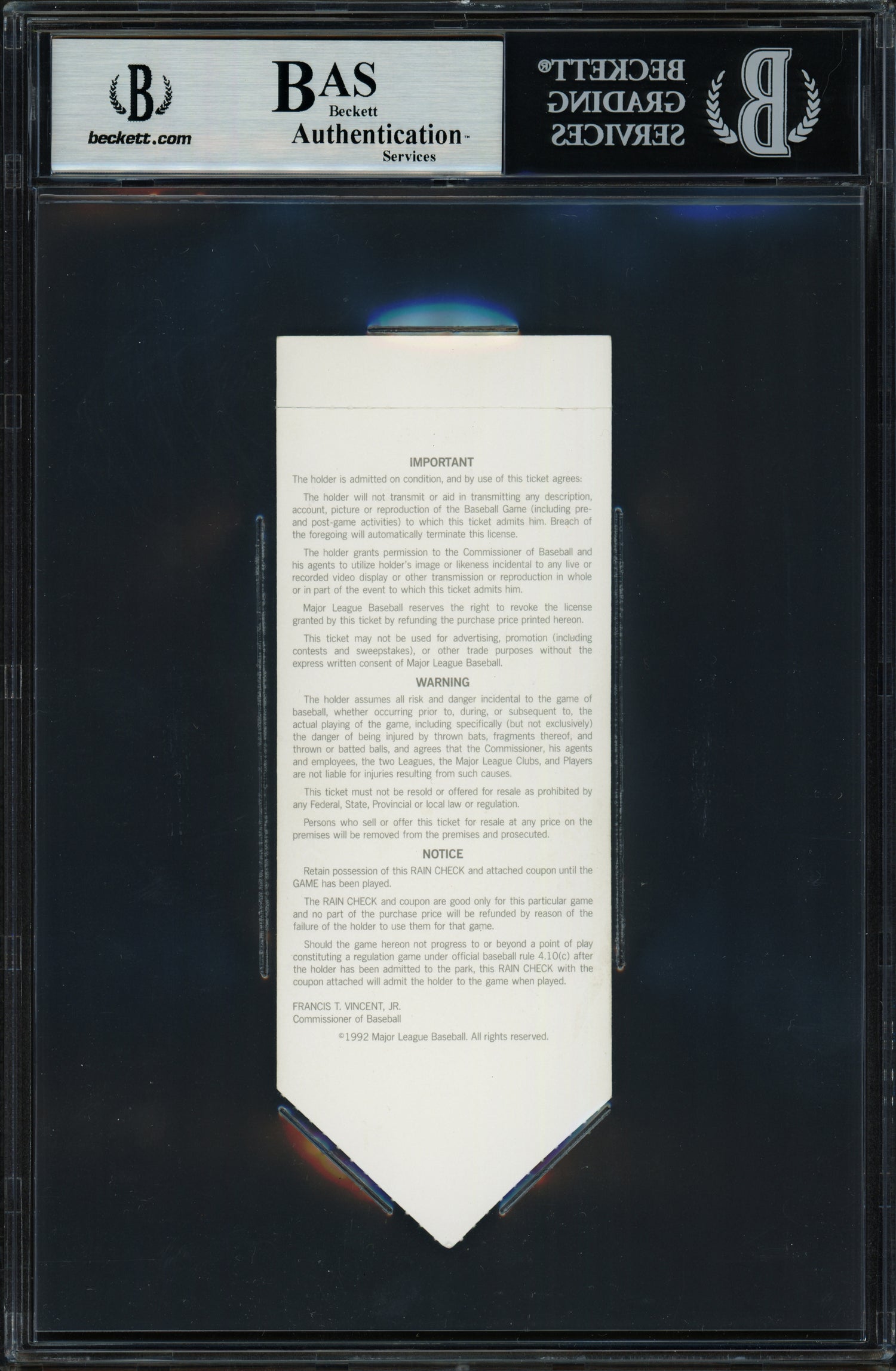 Celebrate one of baseball's most iconic All-Star performances with this Ken Griffey Jr. signed 1992 All-Star Game ticket, measuring approximately 2.5" x 5.5". This authentic collectible is a must-have for serious collectors and Seattle Mariners fans alike, commemorating Griffey's unforgettable MVP performance at the 1992 MLB All-Star Game in San Diego. This limited-edition piece features a bold signature from Ken Griffey Jr. along with the special inscription "92 AS MVP," marking his standout performance where he went 3-for-3 at the plate. Certified by Beckett Authentication Services (BAS), this rare ticket stub comes encapsulated in BAS’s tamper-proof holder for long-term protection and display.