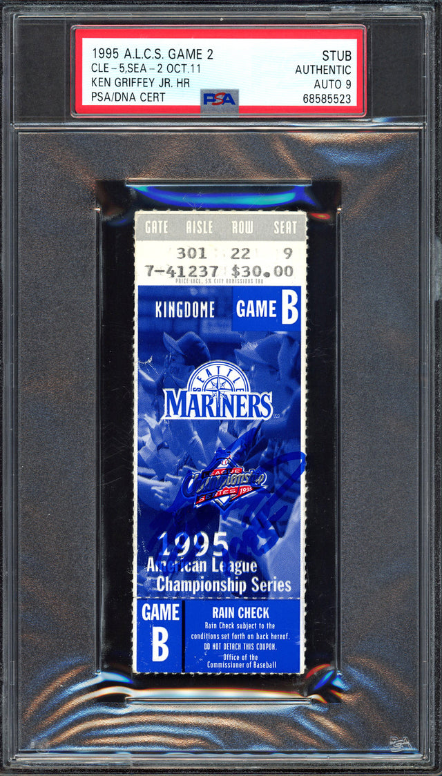 Own a piece of baseball history with this 1995 ALCS Game 2 Ticket Stub, hand-signed by Ken Griffey Jr. Measuring approximately 1.5" x 4", this rare collectible commemorates a thrilling postseason moment where Griffey Jr. hit a crucial home run. The signature has been graded Mint 9 by PSA/DNA, ensuring its top-tier quality. This ticket is inscribed with "1995" and comes encapsulated in PSA/DNA’s tamper-proof holder for authenticity and long-term preservation.