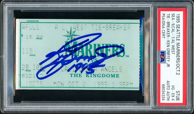 Ken Griffey Jr. Autographed October 2nd, 1995 Ticket Stub Seattle Mariners vs. California Angels Tie-Breaker Game PSA 4 "1995" PSA/DNA #68034334 is backordered and will ship as soon as it is back in stock.