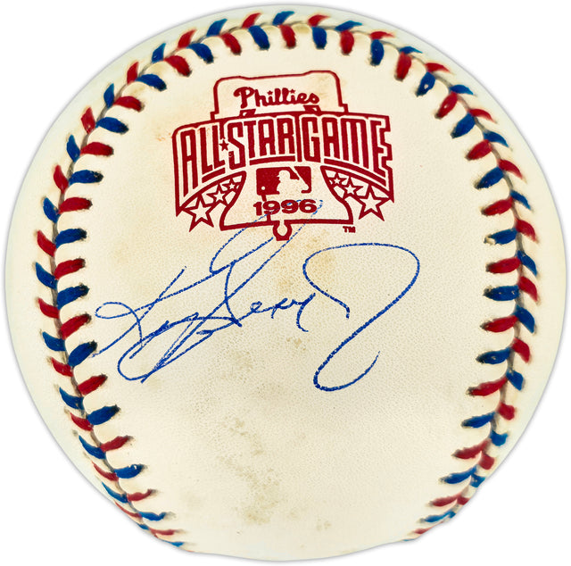 Celebrate one of baseball's most iconic players with this rare collectible: an Official 1996 All Star Game Logo Baseball hand signed by Hall of Famer Ken Griffey Jr. Known for his legendary swing and unforgettable All-Star Game performances, Griffey left an indelible mark on the game. This baseball captures a moment from the historic 1996 MLB All-Star Game, held at Veterans Stadium in Philadelphia—a star-studded event that highlighted Griffey at the peak of his career. While the ball shows some toning consistent with its age, it remains a highly desirable piece for collectors and fans of 1990s baseball.