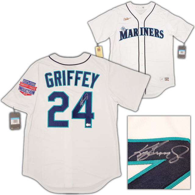 Seattle Mariners Ken Griffey Jr. Autographed White Nike Cooperstown Edition Jersey HOF Patch Size M Beckett BAS QR Stock #206022 is backordered and will ship as soon as it is back in stock.