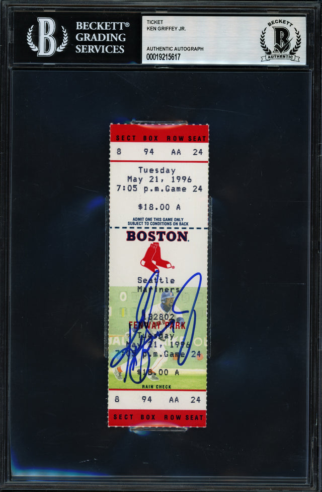 Celebrate one of baseball’s most iconic moments with this Ken Griffey Jr. signed 5/21/96 200th Home Run ticket. This collectible marks the day the Seattle Mariners legend launched his milestone 200th career homer, adding to his legacy as one of the game’s most electrifying sluggers. Measuring approximately 2"x5.5", this original ticket is a rare piece of MLB history and a must-have for serious collectors and fans of 1990s baseball. Authenticated by Beckett Authentication Services (BAS), it comes encapsulated in their tamper-proof holder for long-term preservation and display. Here's why this piece belongs in your memorabilia collection: