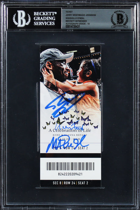 Very low stock (1 unit)$37,499Unit price /Unavailable(3) Magic, Shaquille & West Signed Kobe Bryant COL Ticket Stub Auto 10! BAS Slab