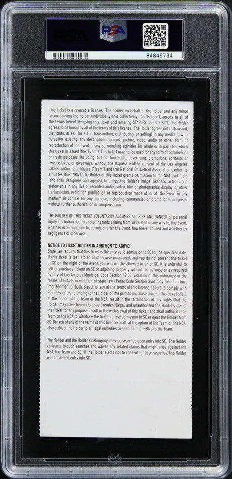 Very low stock (1 unit)$13,499Unit price /UnavailableLakers Kobe Bryant Signed 2016 Final Season Full Ticket Stub PSA Slabbed