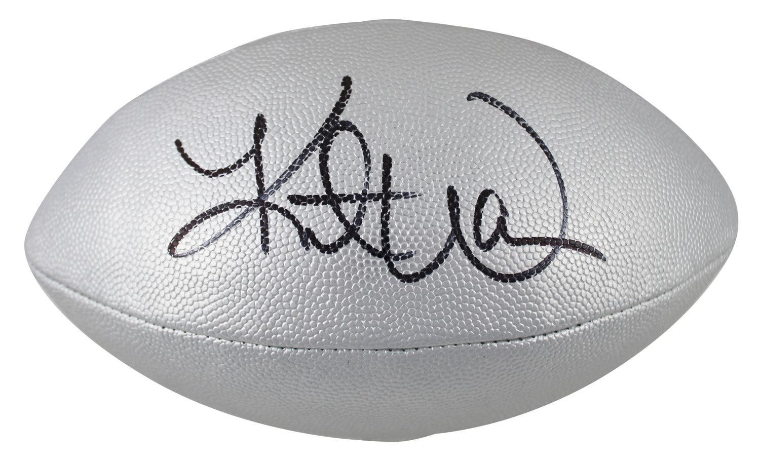 Own a piece of football history with this Autographed Official Wilson Replica Duke Metallic Silver NFL Football, personally signed by legendary quarterback Kurt Warner. A true collectible for fans and memorabilia enthusiasts, this football celebrates Warner’s incredible career, including his MVP performances and Super Bowl triumph.