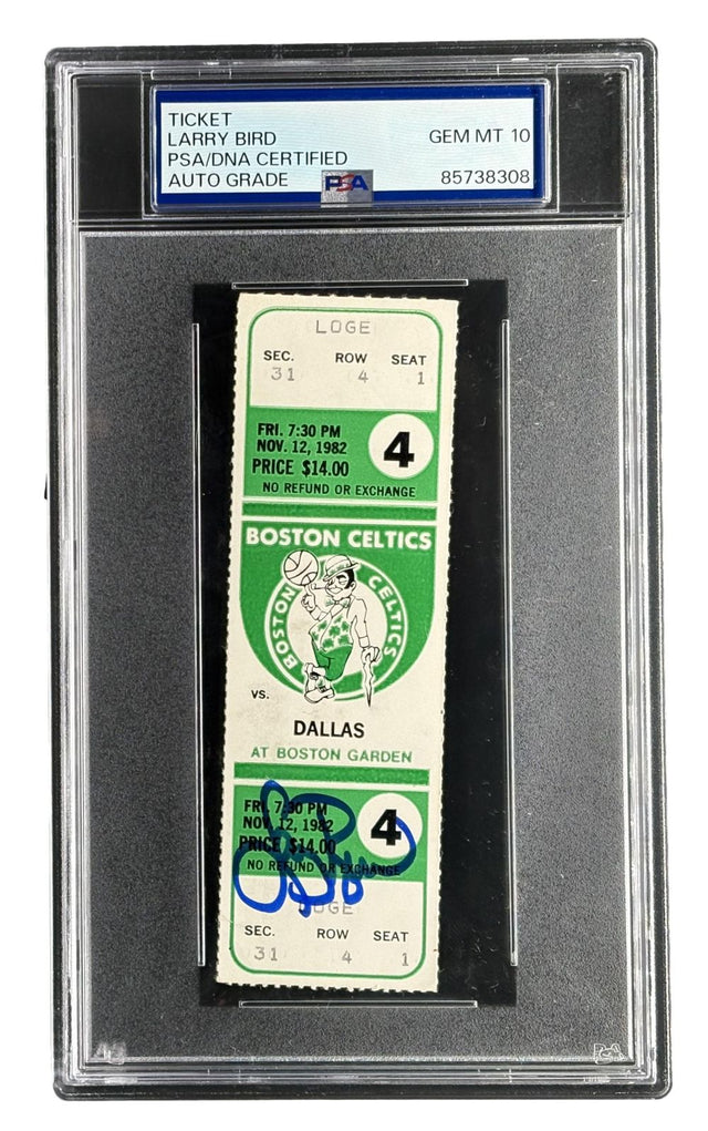 - Item: Boston Celtics vs. Dallas Mavericks ticket stub, dated November 12, 1982; ink-signed; PSA/DNA slabbed; Autograph Grade Gem MT 10