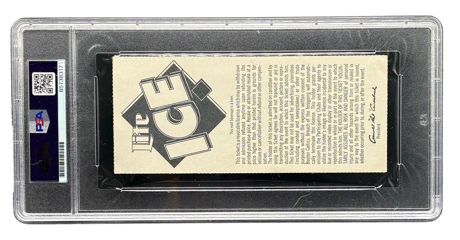 Collector-Grade PSA/DNA authenticated autographed ticket, signed by Larry Bird—elite Celtics memorabilia from March 31, 1995. A three-time NBA champion (1981, 1984, 1986) and three-time consecutive MVP (1984–86), Bird was inducted into the Naismith Memorial Basketball Hall of Fame in 1998. As the face of the Boston Celtics’ modern dynasty and a member of the 1992 Dream Team, his legacy ensures that high-grade, verified autograph pieces remain consistently sought-after.