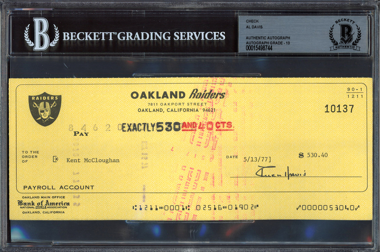 Al Davis Autographed Check Oakland Raiders Owner Auto Grade Gem Mint 10 Beckett BAS #15498744