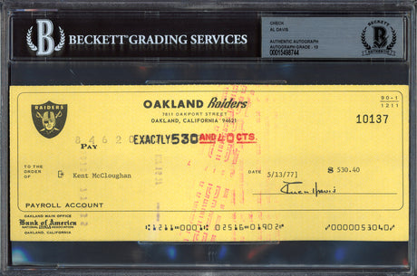 Al Davis Autographed Check Oakland Raiders Owner Auto Grade Gem Mint 10 Beckett BAS #15498749