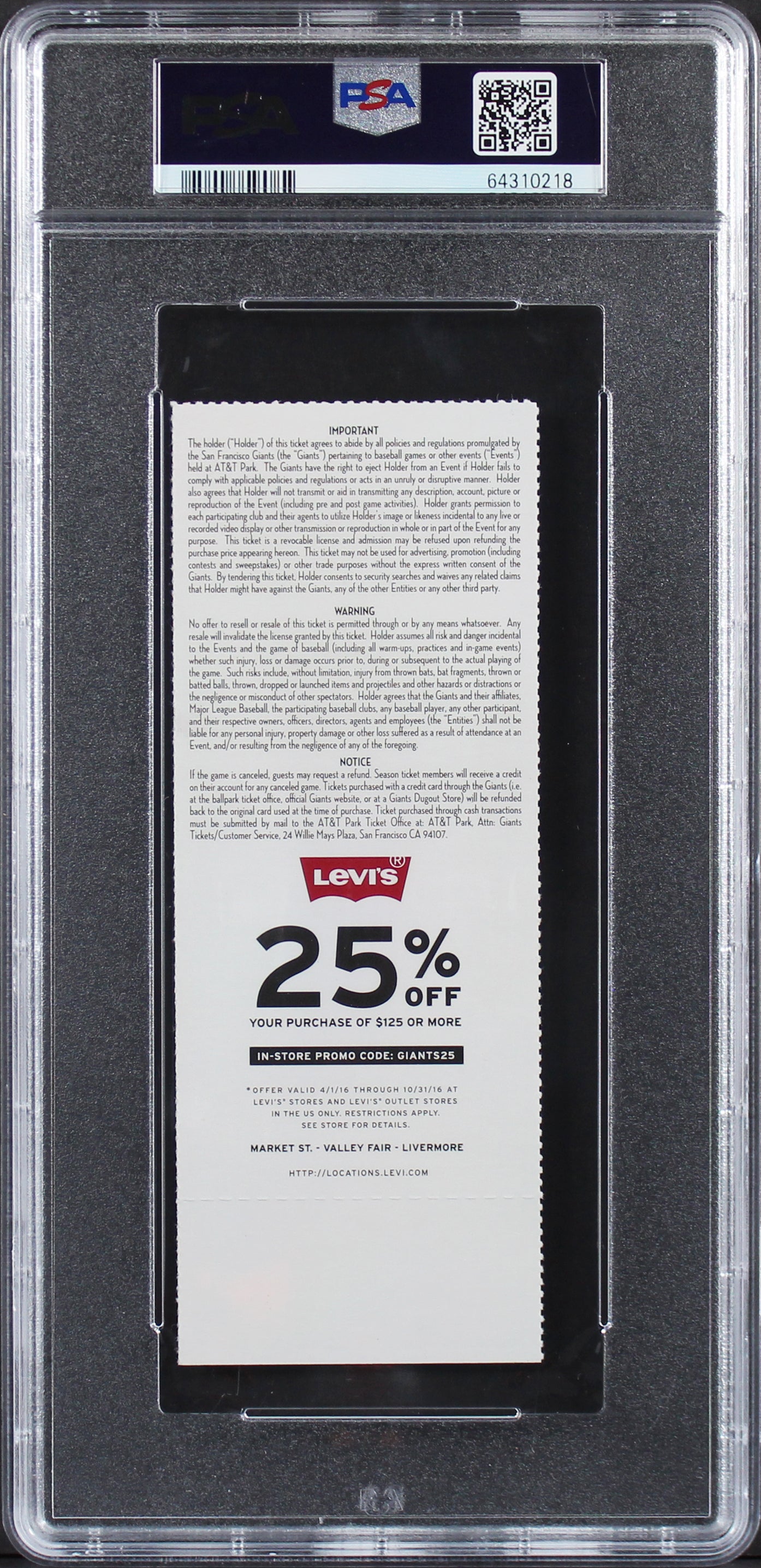 Own a piece of baseball history with this Vin Scully Autographed Full Ticket Stub from the October 2, 2016, San Francisco Giants vs. Los Angeles Dodgers Final Game. This incredible collectible is not only personally signed by legendary Dodgers broadcaster Vin Scully, but it also holds exceptional grading—Ticket Graded NM-MT-8 with an Auto Grade of Gem Mint 10!