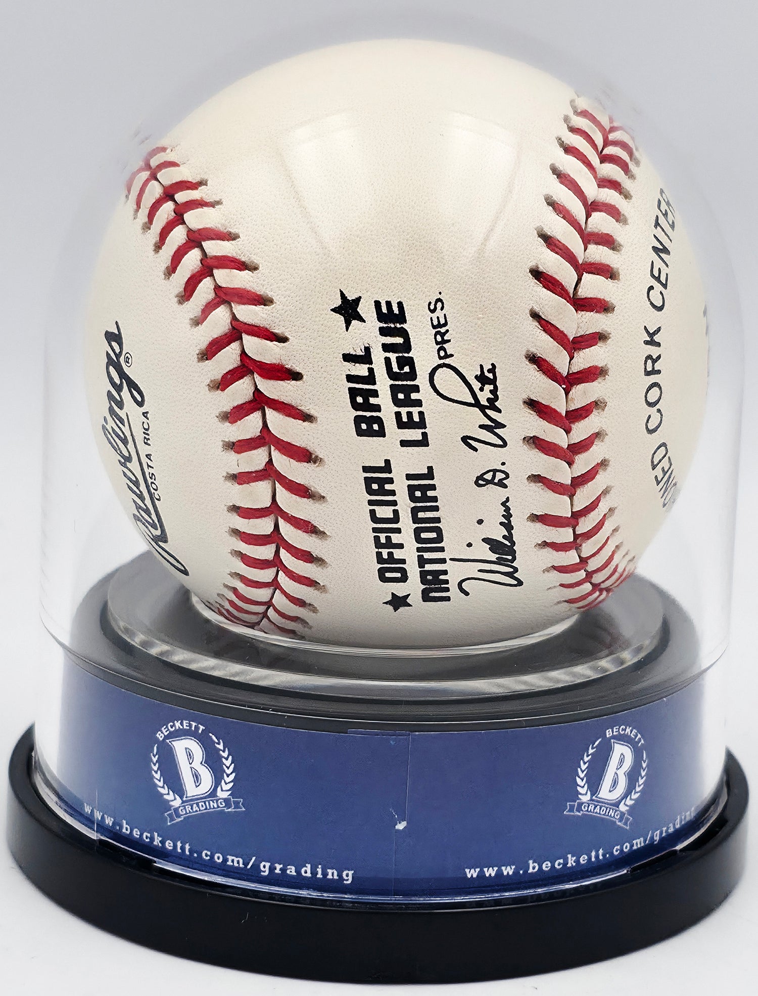 This collectible is a must-have for Los Angeles Dodgers fans and baseball historians alike. Featuring an Official National League Baseball hand-signed by legendary Hall of Fame pitcher Don Drysdale, this piece captures the spirit of one of the most dominant right-handers in MLB history. A cornerstone of the Dodgers through the 1950s and 60s, Drysdale was a nine-time All-Star and the 1962 Cy Young Award winner. Known for his fierce competitive edge and record-setting scoreless innings streak, Drysdale's autograph is a prized addition to any memorabilia collection. This signed baseball has been authenticated and encapsulated by Beckett Authentication Services (BAS), earning a prestigious Mint 9 grade for its striking signature.