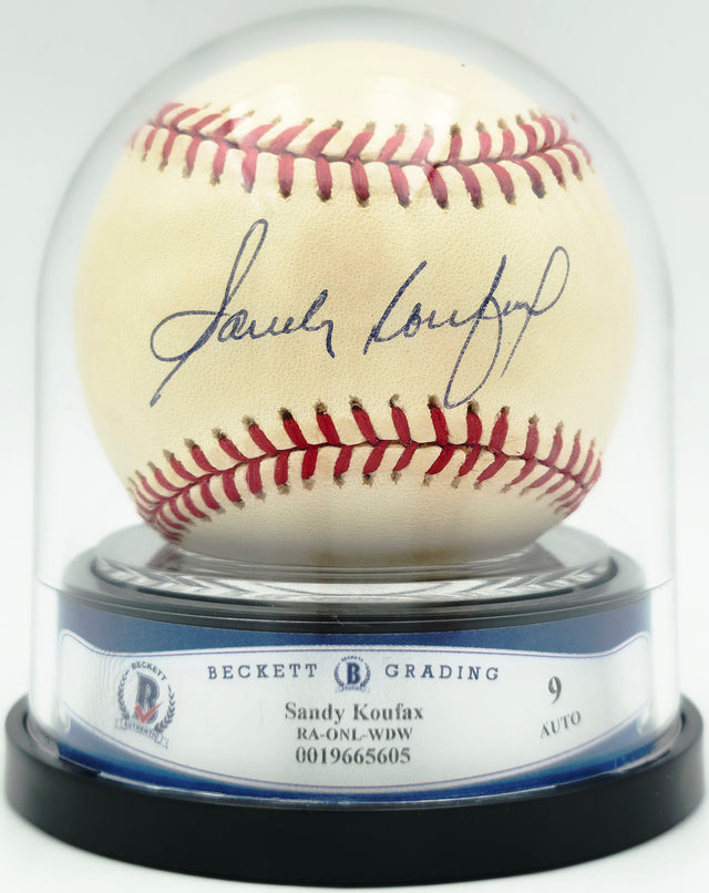 Collector Grade autographed memorabilia: signed Official National League baseball by Sandy Koufax, graded Mint 9 by Beckett BAS. A Hall of Famer (1972), Koufax won three Cy Young Awards and the 1963 NL MVP while leading the Los Angeles Dodgers to three World Series titles. He also authored four no-hitters, including a perfect game in 1965, cementing his place among the greatest pitchers in MLB history.