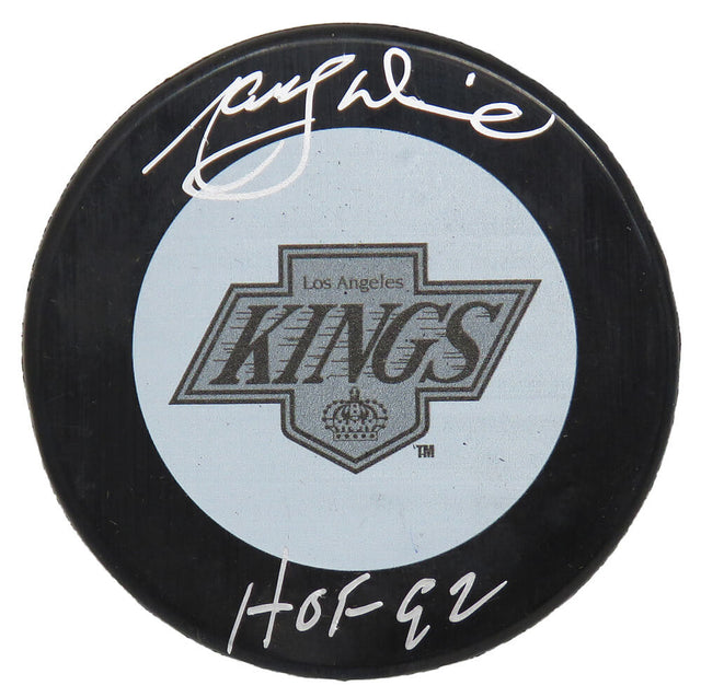 Own a piece of hockey history with this Marcel Dionne signed Los Angeles Kings 1980's style logo hockey puck, complete with a "HOF 92" inscription. A legendary Hall of Famer, Dionne was a dominant force on the ice, leading the Kings with his incredible scoring ability throughout the 1980s. This autographed puck is a must-have for serious collectors and devoted Kings fans alike.