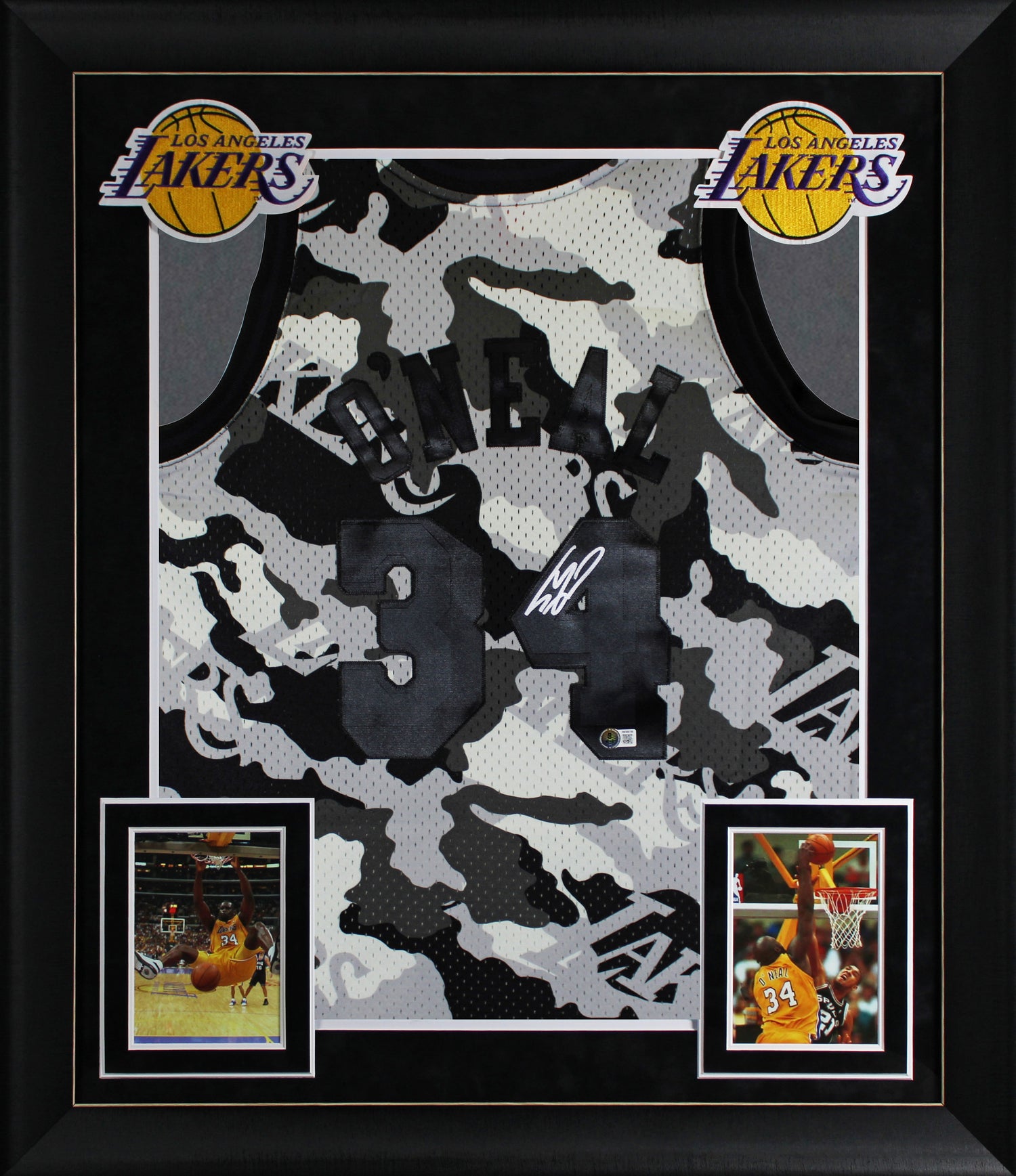 Celebrate NBA greatness with this uniquely collectible Autographed Black Camouflage Mitchell & Ness 1996-97 Hardwood Classics Swingman Framed Jersey, personally signed by legendary big man Shaquille O'Neal of the Los Angeles Lakers. A cornerstone of the Lakers’ dominance in the late 90s and early 2000s, Shaq’s impact on the game is undeniable — and now you can own a piece of that iconic legacy. This premium jersey pays tribute to the 1996-97 NBA season, a pivotal era marking Shaq’s early years with the Lakers after joining the team in 1996. The black camouflage design adds a modern edge to a timeless Hardwood Classics piece, making it ideal for any serious collector or basketball enthusiast. Professionally framed and authenticated by Beckett Authentication Services (BAS), this jersey combines authenticity, presentation, and historical relevance in one show-stopping display. The frame measures approximately 32 x 37 inches, making it the perfect centerpiece for your memorabilia wall.