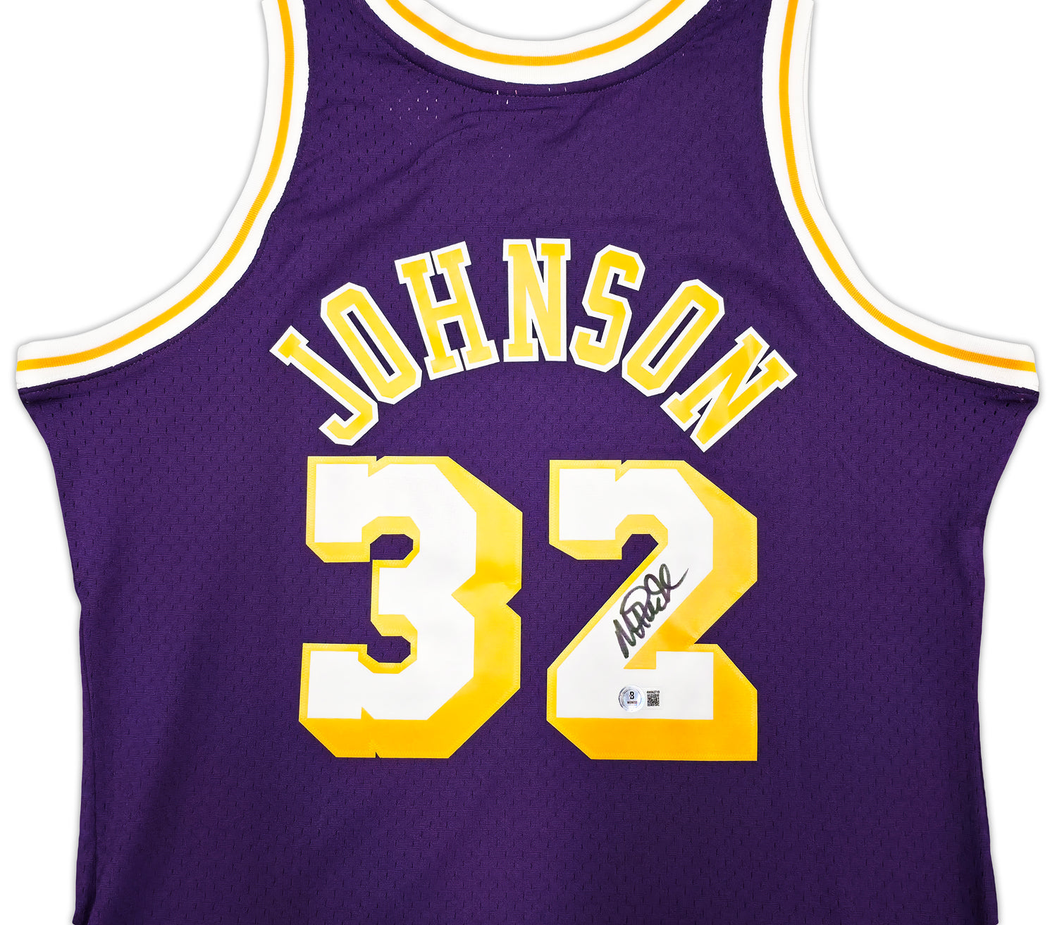 Celebrate a golden era of Lakers basketball with this stunning Purple Authentic Mitchell & Ness Los Angeles Lakers 1984-85 Hardwood Classic Swingman Jersey, personally hand signed by the legendary Magic Johnson. A must-have collectible for fans of classic NBA history and Magic’s unmatched Showtime legacy, this jersey pays tribute to one of the most electrifying seasons in Los Angeles Lakers history during the 1984-85 campaign. This Size XL jersey combines nostalgic design with official authenticity, making it a showpiece worthy of any collection—from lifelong Lakers fans to autograph seekers and sports memorabilia collectors. Authenticated by Beckett Authentication Services (BAS), it includes their tamper-proof witness hologram for complete peace of mind and provenance.