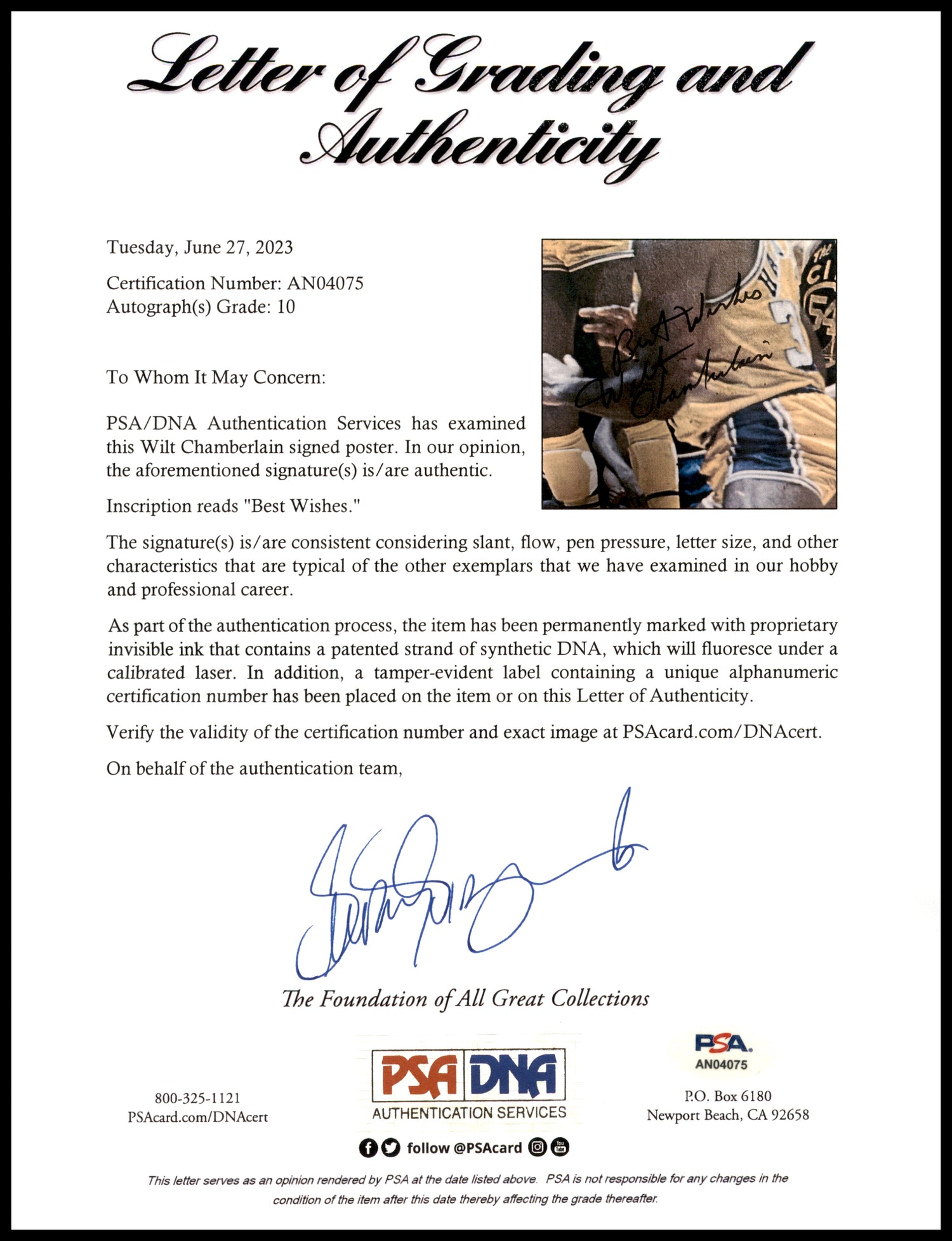 - Authentic Signature – Signed by Wilt Chamberlain with the inscription "Best Wishes."