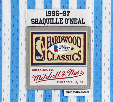 Lakers Shaquille O'Neal Signed B&W Striped 1996-97 M&N HWC Swingman Jersey BAS