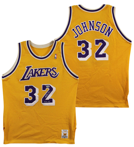 Lakers Magic Johnson "Showtime" Signed Yellow M&N HWC Swingman Jersey BAS Wit