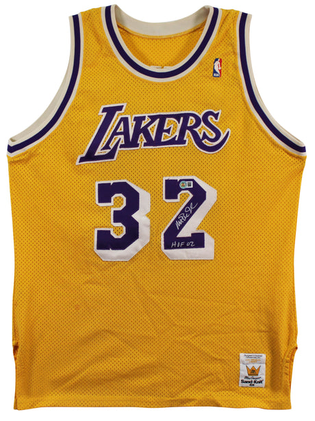 Lakers Magic Johnson "HOF 02" Signed Yellow MacGregor Sand-Knit Jersey BAS Wit 1