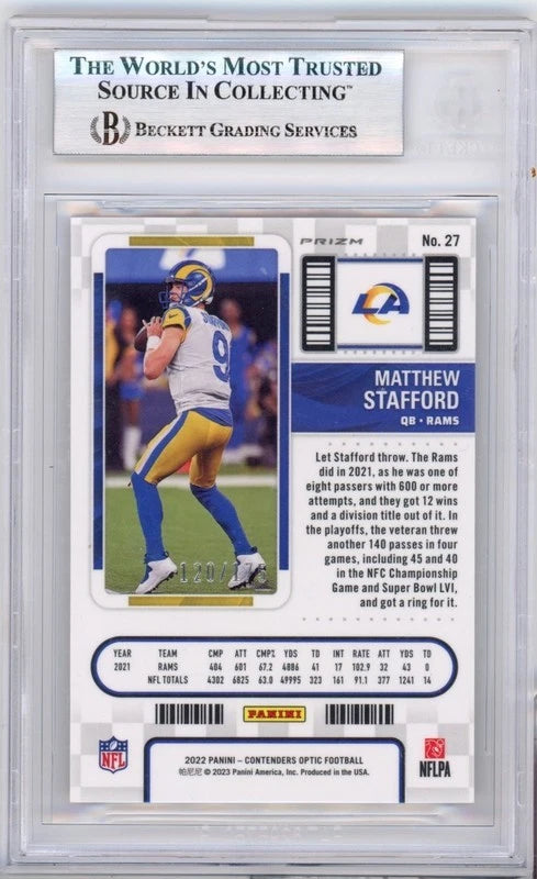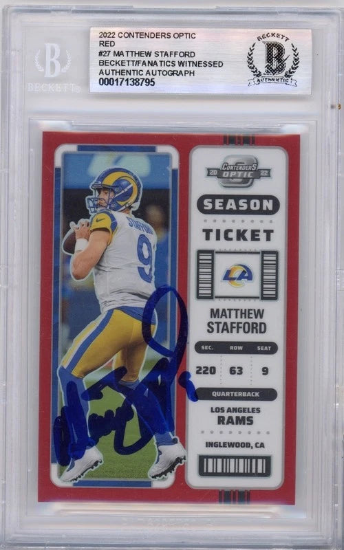 Matthew Stafford Autographed Los Angeles Rams 2022 Panini Contenders Optic Red #27 #/175 BAS Authenticated Trading Card Fanatics is backordered and will ship as soon as it is back in stock.