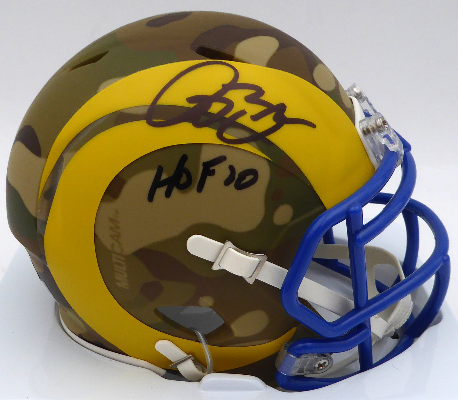 This St. Louis Rams Camo Speed Mini Helmet is a must-have collectible for dedicated Rams fans and sports memorabilia enthusiasts. Personally hand-signed by Hall of Famer Isaac Bruce, this mini helmet is a tribute to one of the greatest wide receivers in NFL history.