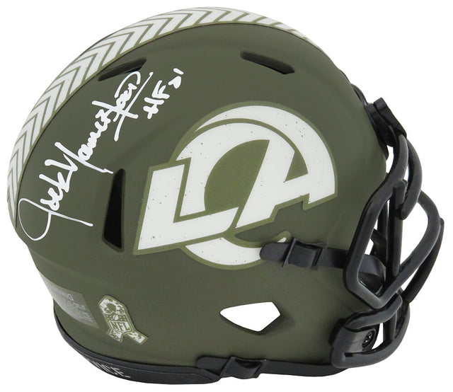 Own a piece of Los Angeles Rams history with this Jack Youngblood signed Salute to Service Riddell Speed mini helmet. A Hall of Famer known for his toughness and dedication, Youngblood was a dominant force on the defensive line and a key figure in Rams history. This collectible mini helmet is enhanced with his "HOF 01" inscription, marking his 2001 induction into the Pro Football Hall of Fame.