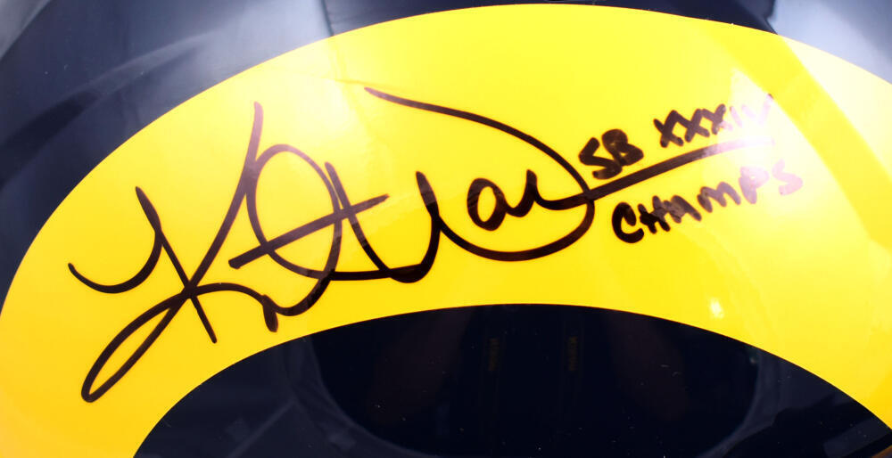 Own a piece of football history with this Kurt Warner autographed Riddell Full-Size Speed Replica Helmet, celebrating his legendary career with the St. Louis Rams. This officially licensed helmet is hand-signed by Warner and inscribed with "SB Champs," commemorating his incredible leadership in Super Bowl XXXIV.