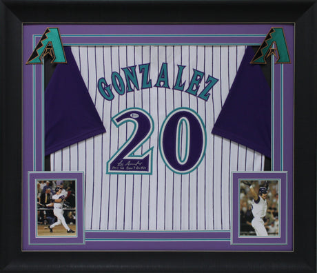 Luis Gonzalez "2001 WS G7 GW Hit" Signed White Pinstripe Framed Jersey BAS Wit
