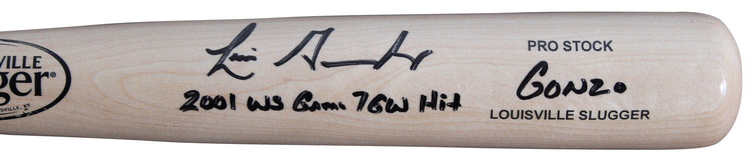 Celebrate one of the most iconic moments in Arizona Diamondbacks history with this Autographed Blonde Louisville Slugger Baseball Bat, personally signed by Luis Gonzalez—the hero of the 2001 World Series Game 7. This exclusive collectible features the hand-inscribed phrase: "2001 WS Game 7 GW Hit, Gonzo", commemorating the dramatic walk-off hit that clinched the franchise’s first championship against the New York Yankees. A true must-have for Diamondbacks fans and baseball history collectors alike, this piece honors a defining moment in MLB postseason lore.