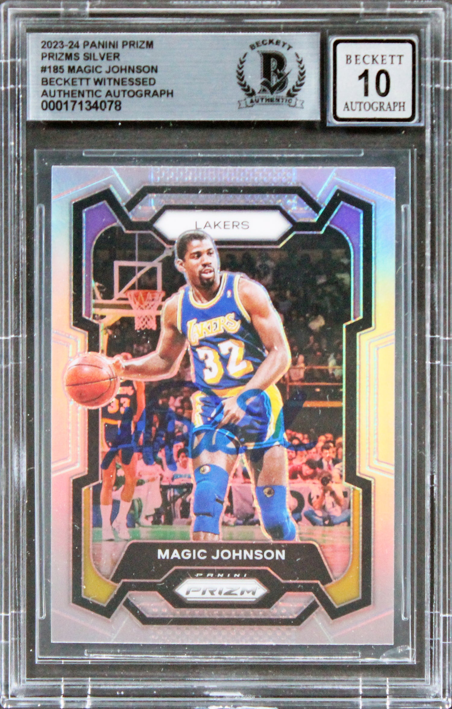 Own a piece of basketball history with this Autographed Auto Graded Gem Mint 10! 2023 Panini Prizm Prizms Silver #185 Card, personally signed by Magic Johnson of the Los Angeles Lakers. A must-have for serious collectors and Lakers fans, this card showcases the legendary Magic Johnson, one of the greatest point guards in NBA history.