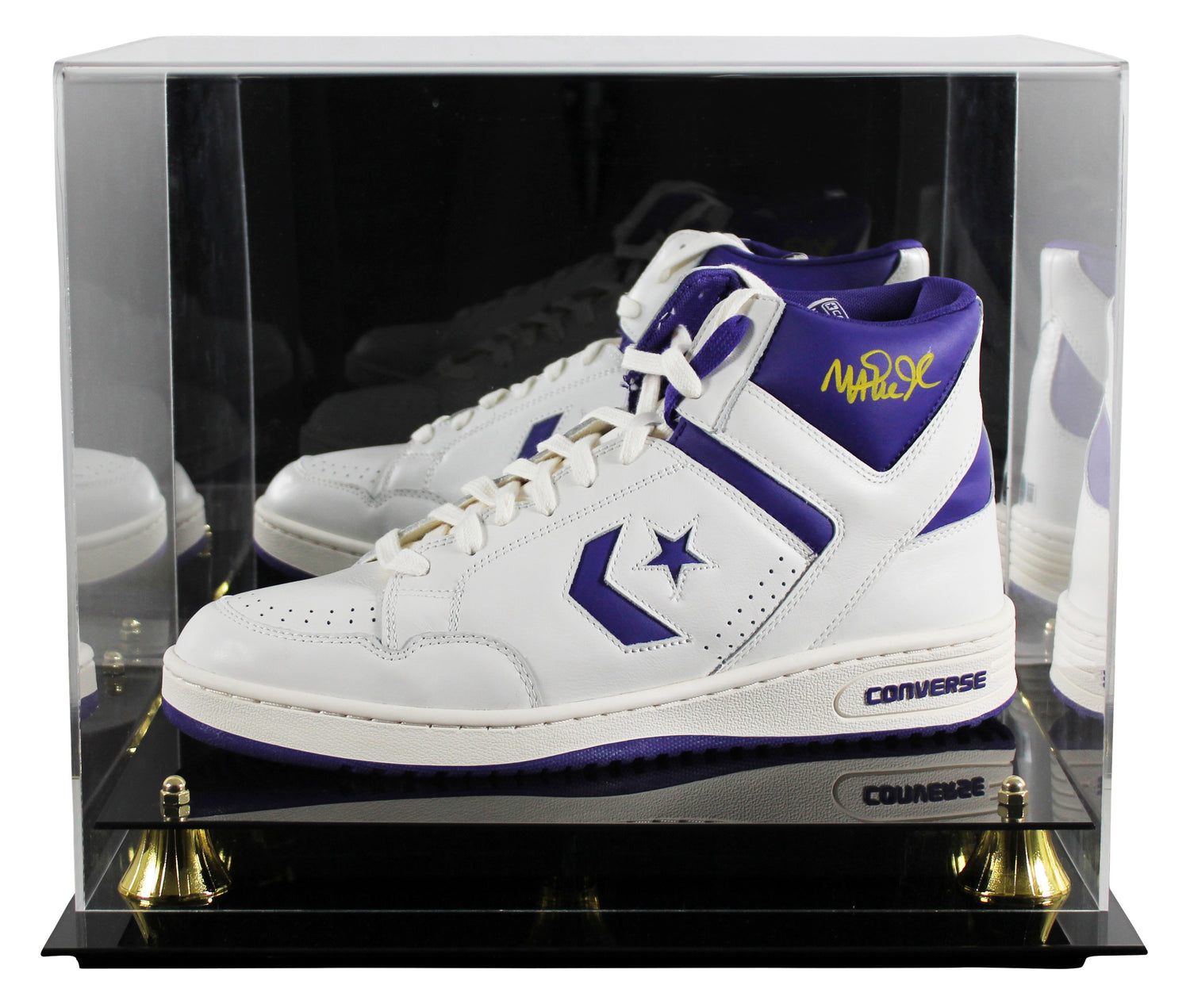 Own a piece of basketball history with this Autographed Left Purple & White Converse Weapon Shoe with UV Mirrored Back Acrylic Display Case, personally signed by Lakers legend Magic Johnson. Revered as one of the NBA’s all-time greats, Magic Johnson led the Los Angeles Lakers to five NBA Championships during the iconic "Showtime" era of the 1980s. Now, you can celebrate that legacy with this bold and authentic collector’s piece—perfect for any serious Lakers fan or sports memorabilia collector. Each shoe in this limited series has been hand-signed by Magic Johnson during an official autograph session witnessed by Beckett Authentication Services (BAS), one of the industry’s leading authentication providers. The autograph is verified through the BAS Witness Protection Program, adding trust and long-term value to your investment.
