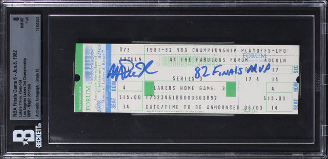 Own a piece of basketball history with this Autographed June 8, 1982 Game 6 Full Ticket Stub, personally signed by Magic Johnson of the Los Angeles Lakers. This rare collectible is not only graded EX-MT 8, but also features an Auto Graded Gem Mint 10! rating, ensuring its superior condition. Adding to its uniqueness, Magic Johnson has inscribed "82 Finals MVP," commemorating his legendary performance in the 1982 NBA Finals.