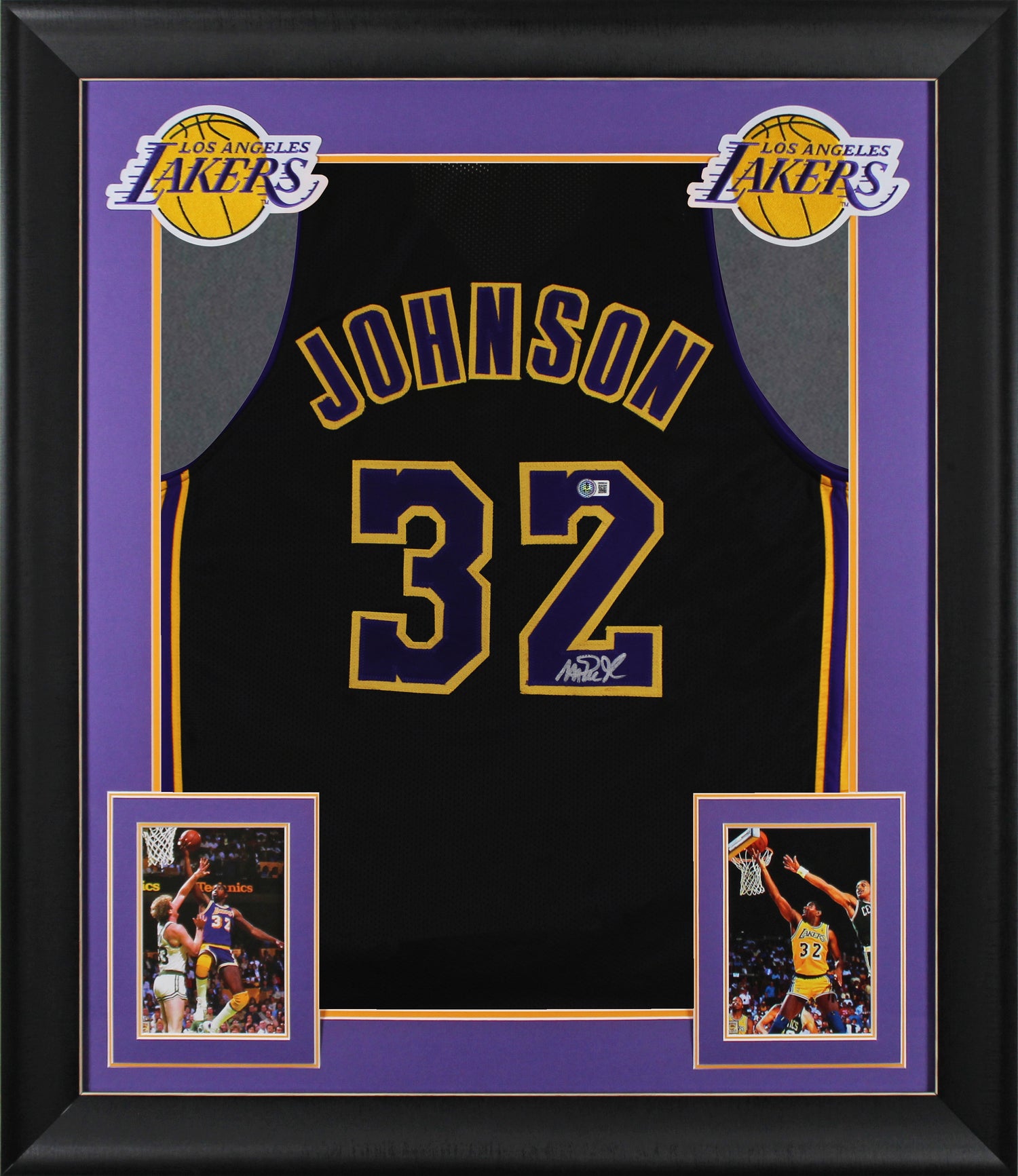 Magic Johnson Signed Black Pro Style Framed Jersey w/ Purple Numbers BAS Wit 2