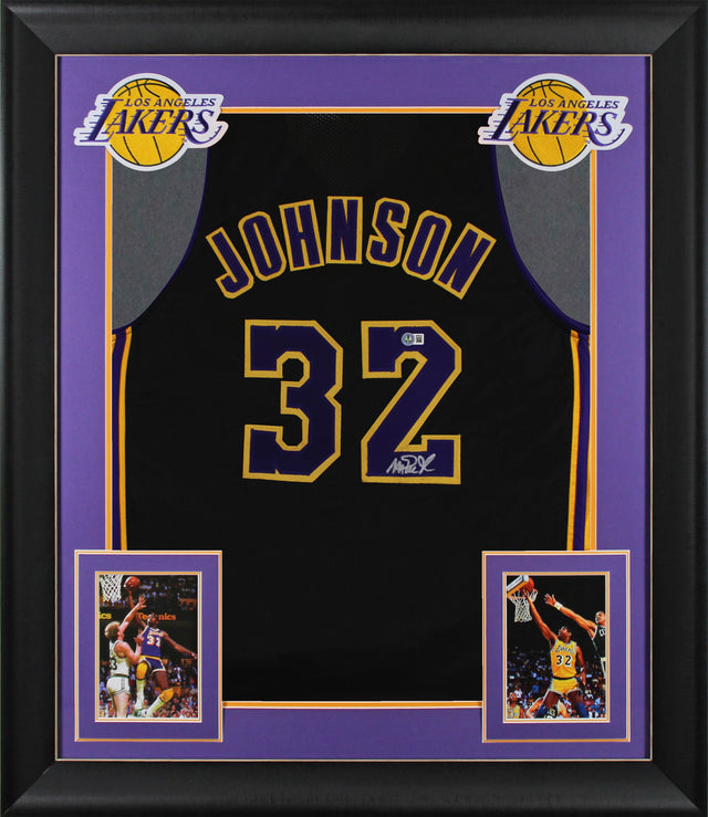 Celebrate basketball greatness with this Magic Johnson Autographed Black Pro Style Framed Jersey with Purple Numbers, a must-have collectible for any true Los Angeles Lakers fan. Known for leading the Lakers to five NBA championships and redefining the point guard position with his incredible vision and charisma, Magic Johnson remains one of the most iconic figures in NBA history. This striking framed jersey is the perfect tribute to his legacy and a standout centerpiece for your memorabilia collection.