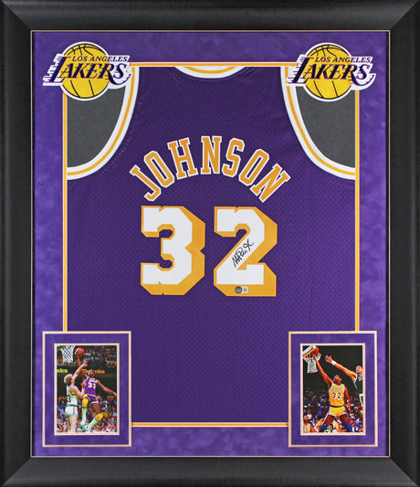 Lakers Magic Johnson Signed 1984-85 M&N HWC Swingman Purple Framed Jersey BAS W