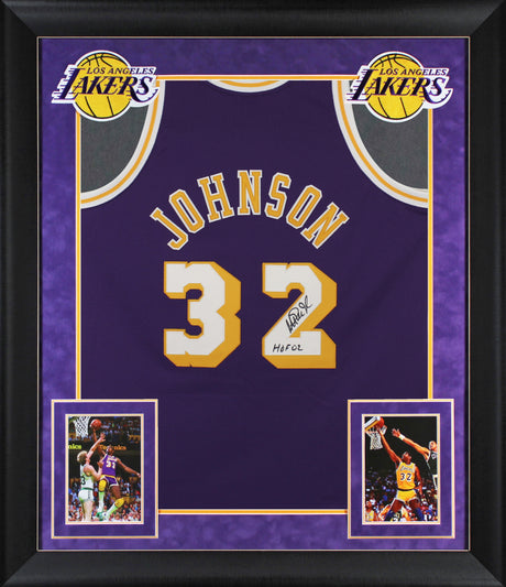 Lakers Magic Johnson "HOF 02" Signed Purple M&N HWC Swingman Framed Jersey BAS W