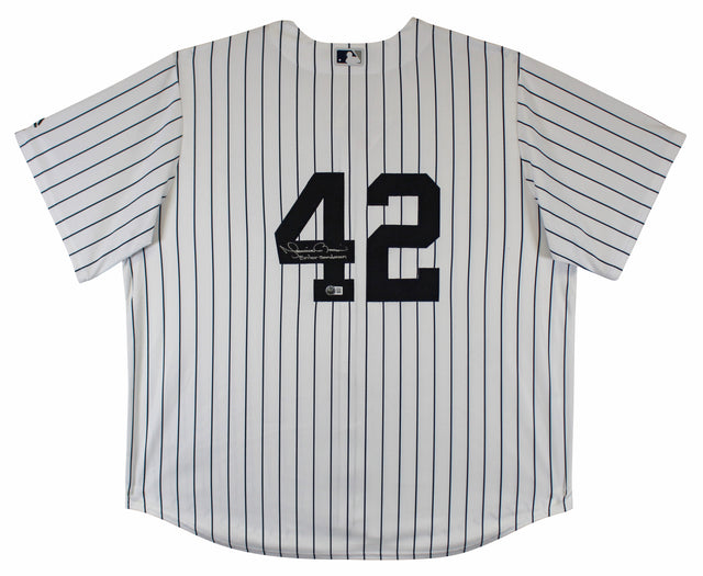Own a piece of baseball history with this Mariano Rivera Autographed White Pinstripe Majestic Cool Base Jersey, inscribed with "Enter Sandman." Rivera, the legendary closer for the New York Yankees, signed this jersey as part of an exclusive memorabilia signing. This collectible is 100% authentic, certified through Beckett Authentication Services (BAS).