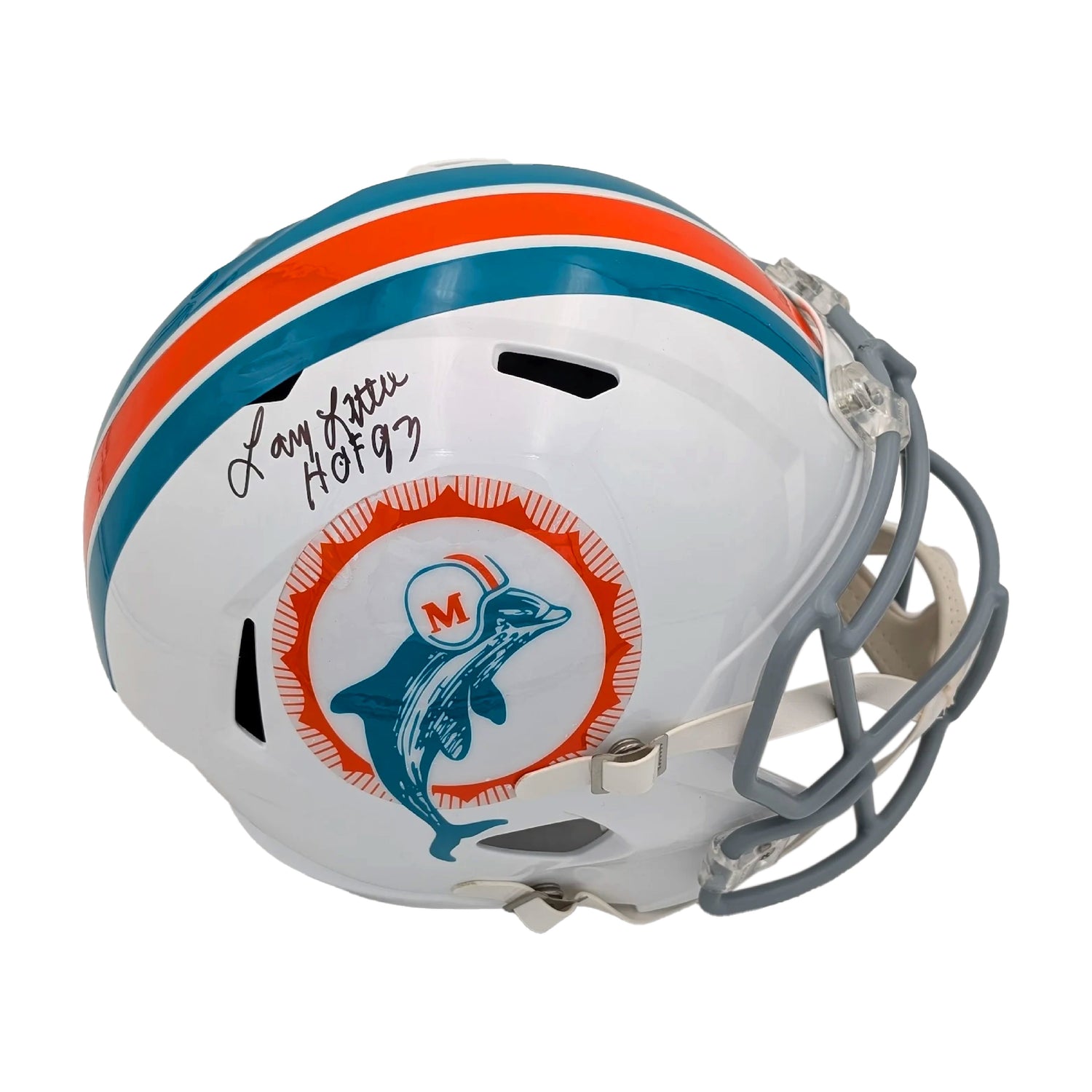 Fan-Grade autographed, signed memorabilia: Larry Little "HOF 93" 1972 Miami Dolphins full-size replica helmet — authenticated by Schwartz Sports. Larry Little anchored Miami’s line through the franchise’s back-to-back titles (Super Bowls VII and VIII) and the NFL’s only perfect season in 1972. Inducted into the Pro Football Hall of Fame in 1993, he earned five Pro Bowls and three First-Team All-Pro honors.
