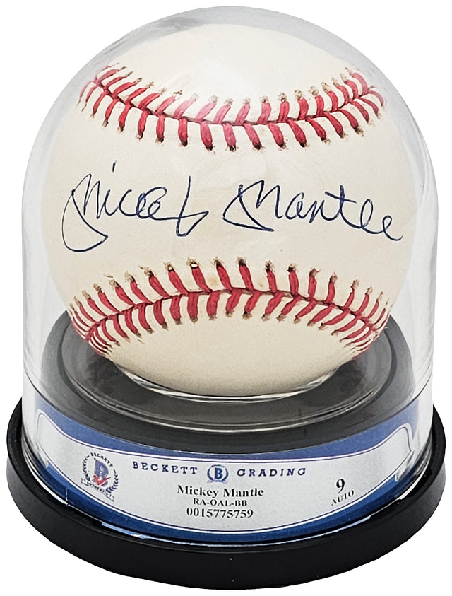 Own a piece of baseball history with this Official American League Baseball hand-signed by the legendary Mickey Mantle. A true collector's item, this baseball is authenticated by Beckett Authentication Services (BAS) and graded Mint 9 for the signature’s exceptional quality. Encapsulated in BAS’s tamper-proof holder, this memorabilia is a must-have for serious collectors and New York Yankees fans alike.