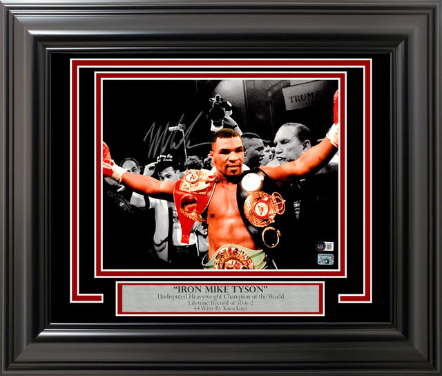 Mike Tyson Autographed Framed 11x14 Photo With Belts Beckett BAS QR Stock #256663 is backordered and will ship as soon as it is back in stock.