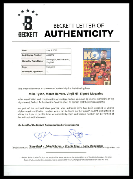 Low stock (3 units)$339Unit price /UnavailableMike Tyson, Marco Antonio Barrera & Virgil Hill Autographed KO Magazine Beckett BAS #AC56742