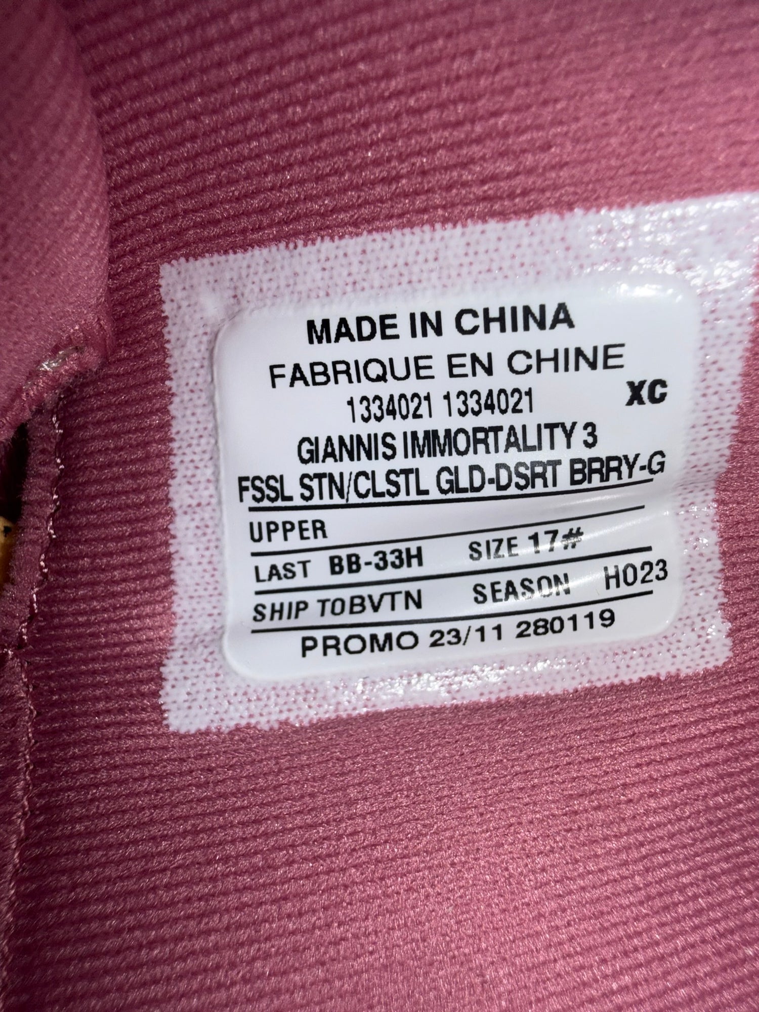 Own a rare piece of basketball history with this pair of 2023 Player Exclusive (PE) Promo FSSL STN/CLSTL GLD-DSRT BRRY-G Nike Immortality 3 Shoes, personally hand-signed by two-time NBA MVP Giannis Antetokounmpo. Crafted exclusively for Giannis, these Size 17 shoes—his personal shoe size—were not made available to the general public, making them a coveted collector's item for serious fans and sneakerheads alike. Designed as Player Exclusive Promo Shoes, they represent a unique intersection of performance design, star power, and exclusivity.