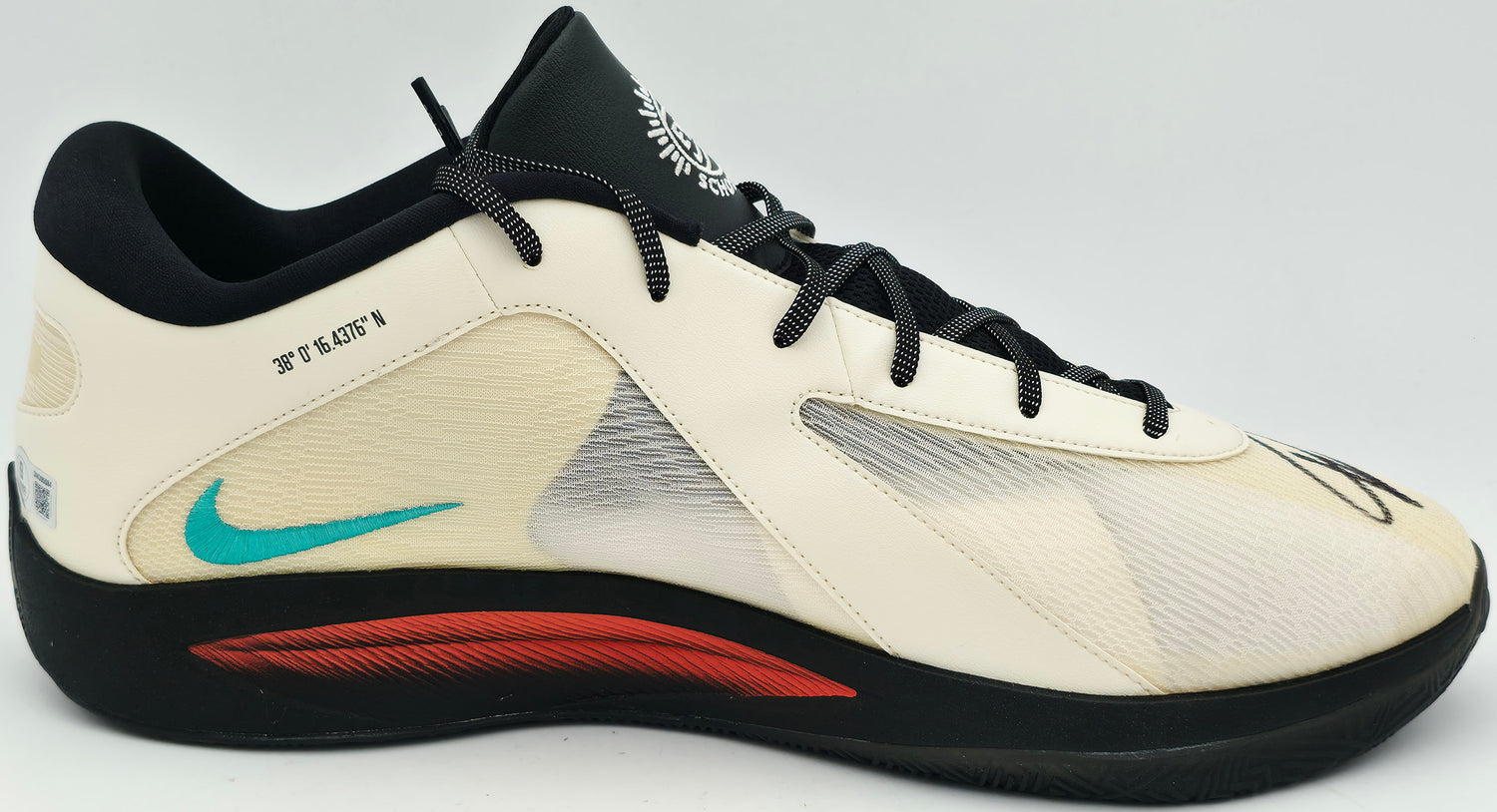 Own a rare and exclusive piece of NBA history with this 2024 Player Exclusive Nike Zoom Freak 6 Promo Shoe Pair, personally hand-signed by Giannis Antetokounmpo. These Pale Ivory & Racer Blue indoor/outdoor sneakers are not available to the public and were crafted specifically as a Player Exclusive (PE) Promo for promotional or personal use by Giannis himself. These shoes come in size 17, matching the exact size worn by the Milwaukee Bucks superstar. A must-have for serious collectors and basketball fans alike, this incredible item brings you closer to the legacy of a two-time MVP and NBA Champion.