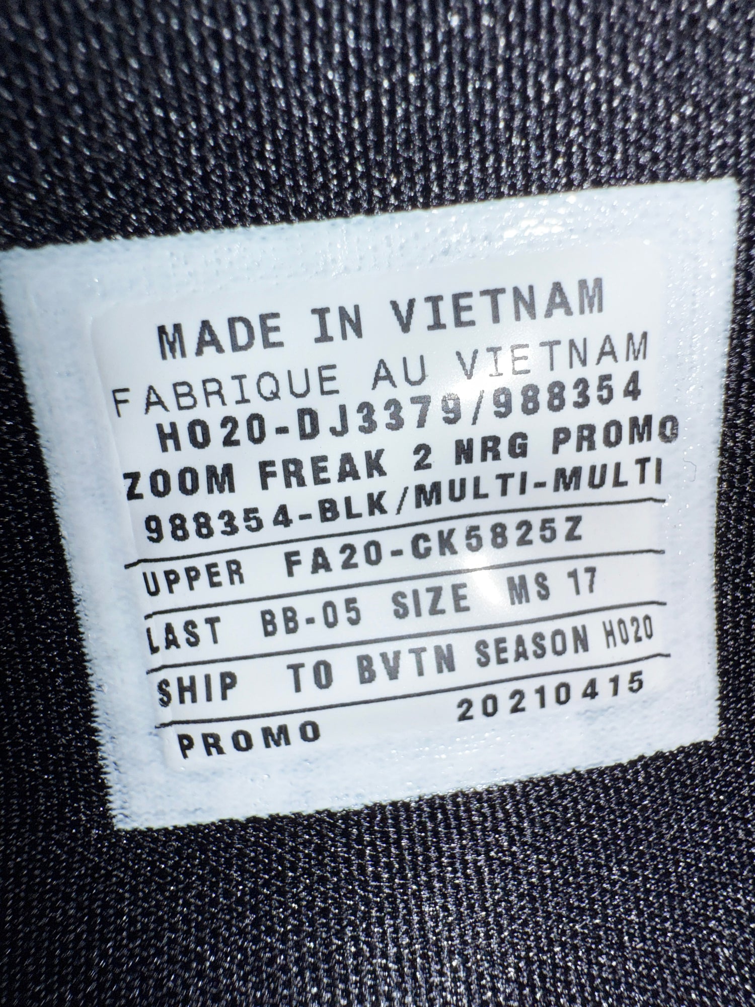 - Player Exclusive Design: 2021 Nike Zoom Freak 2 NRG in Black/Multi/Multi—crafted specifically for promotional use
