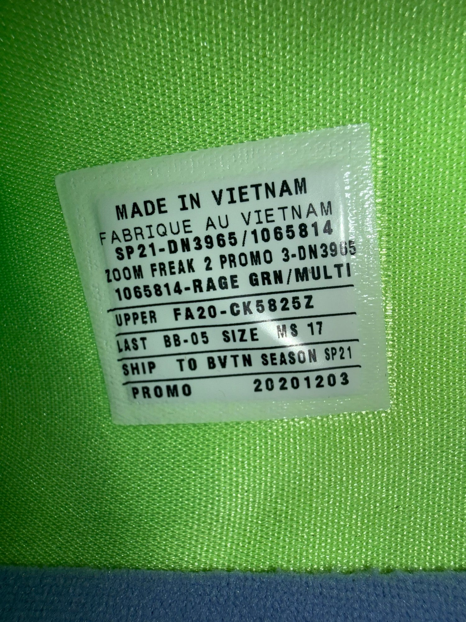 • Authentic hand-signed 2021 PE Nike Zoom Freak 2 "RAGE GREEN/MULTI" shoe by Giannis Antetokounmpo