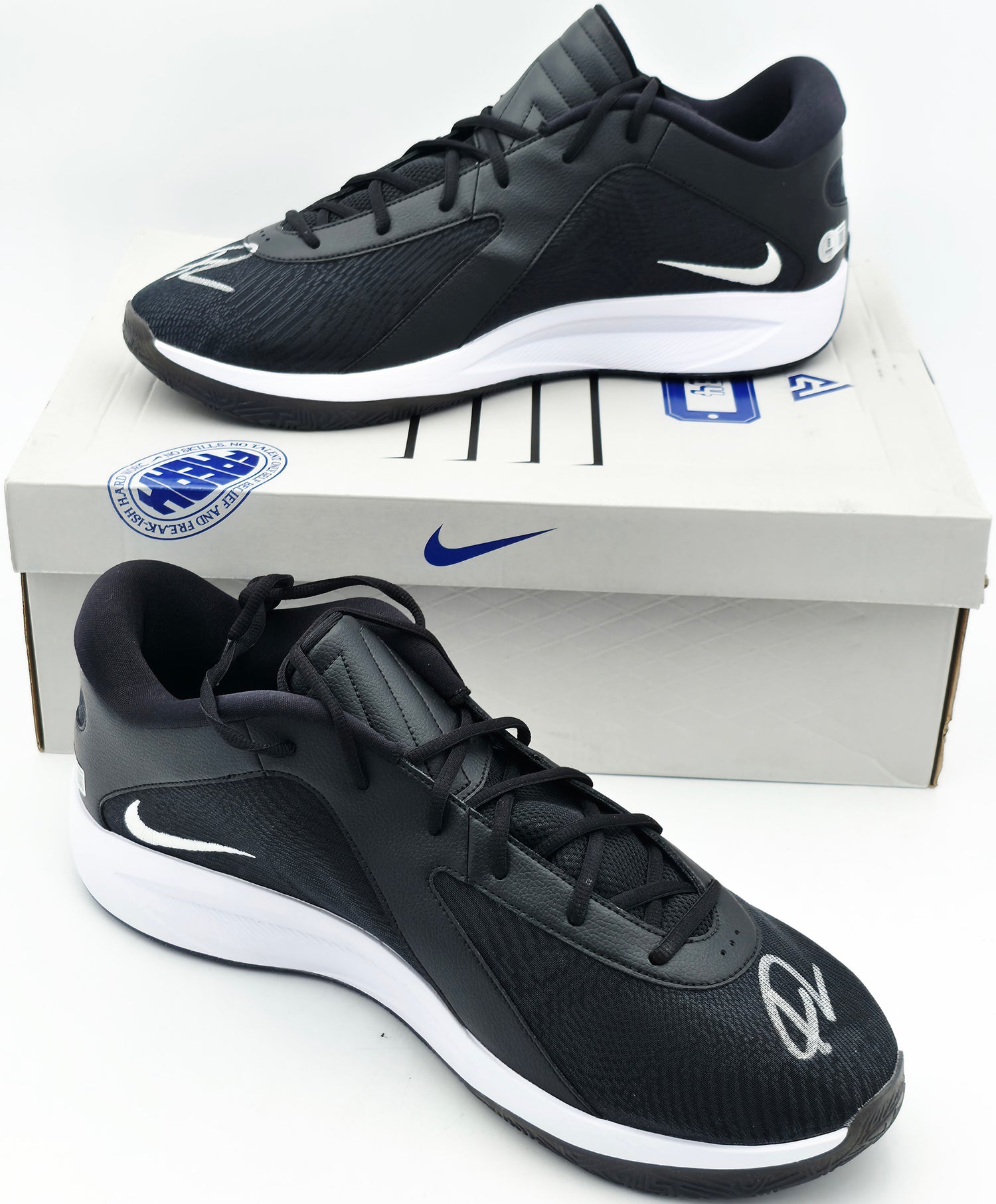 This exclusive pair of 2024 Player Exclusive (PE) Promo Black/Flat Silver/White Nike Zoom Freak 6 Shoes has been personally hand-signed by NBA superstar Giannis Antetokounmpo, making it a prized addition to any basketball memorabilia collection. Styled in Giannis’ own shoe size 17, these limited edition sneakers offer fans a rare opportunity to own authentic gear from the “Greek Freak” himself—one of the most dominant players of his generation and a multi-time NBA All-Star and MVP. Each autographed pair has been witnessed and certified authentic by Beckett Authentication Services (BAS), and comes with a tamper-proof BAS witness hologram to guarantee legitimacy. Whether you're shopping for a collector or a die-hard Milwaukee Bucks or Giannis fan, these shoes are a high-impact centerpiece item that encapsulates the energy of modern NBA greatness.